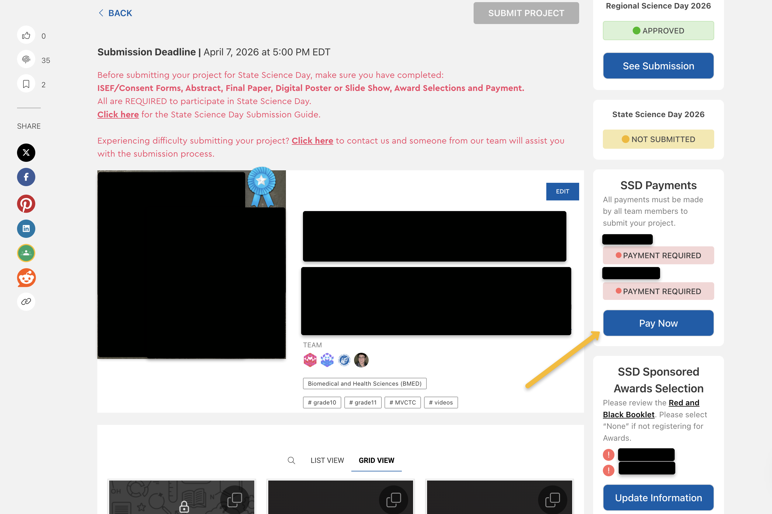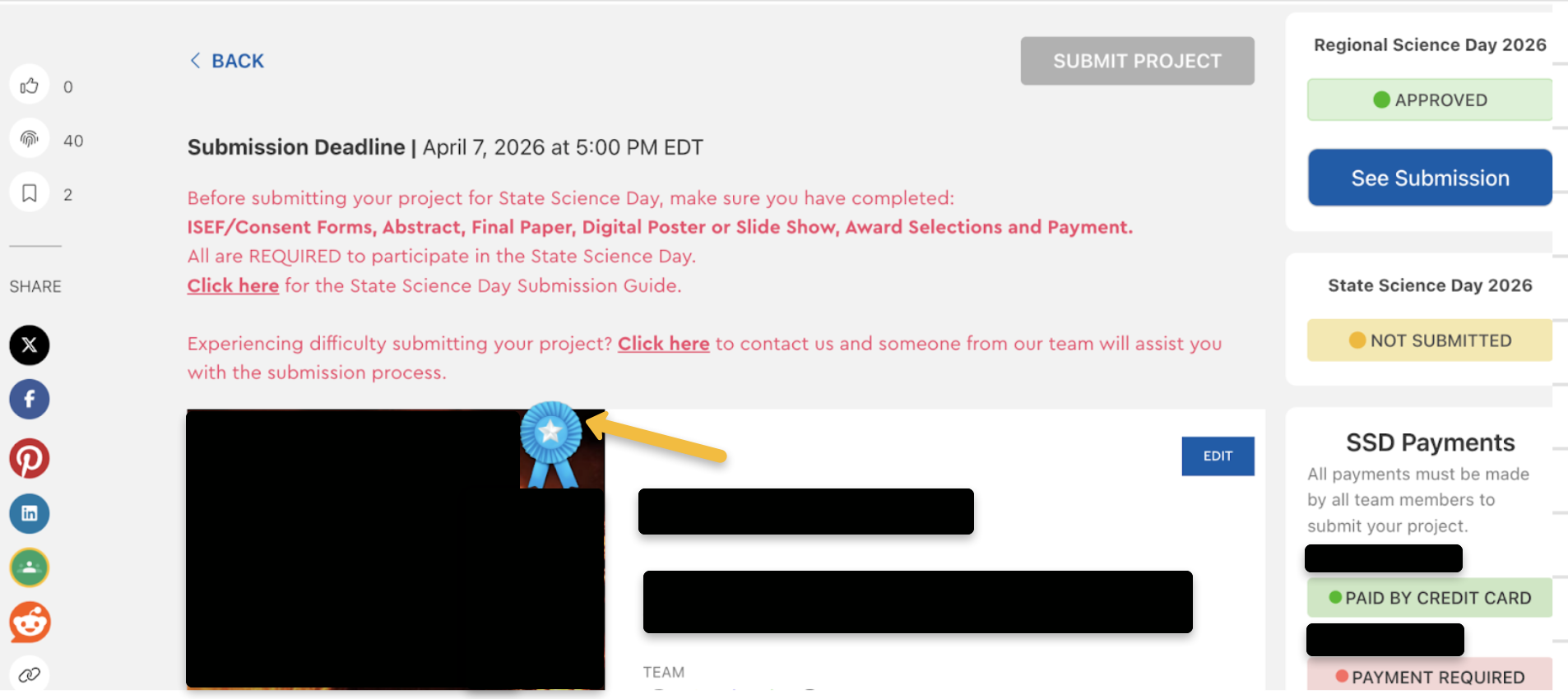 Qualifying projects will have a State Science Day Ribbon displayed on the project cover image (see image below) . If your project has a ribbon displayed, proceed with the submission process.