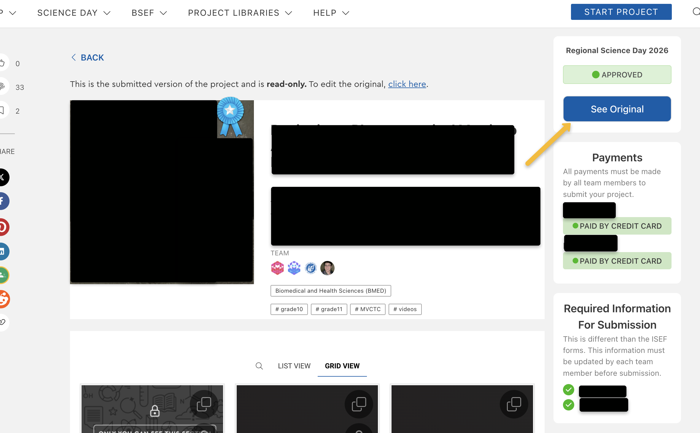 Note: If you are on a submitted version of your project (eg. Regional Science Day submission) you will first need to go to your Original Project. You can do this by clicking on see Original button on the right, or Click here link at the top of the project ( see image below)