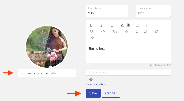Click on the username field below the profile image. The username field has a ‘@’ prefix. Enter your new username after the ‘@’ and click on the ‘Save’ button when you are done.